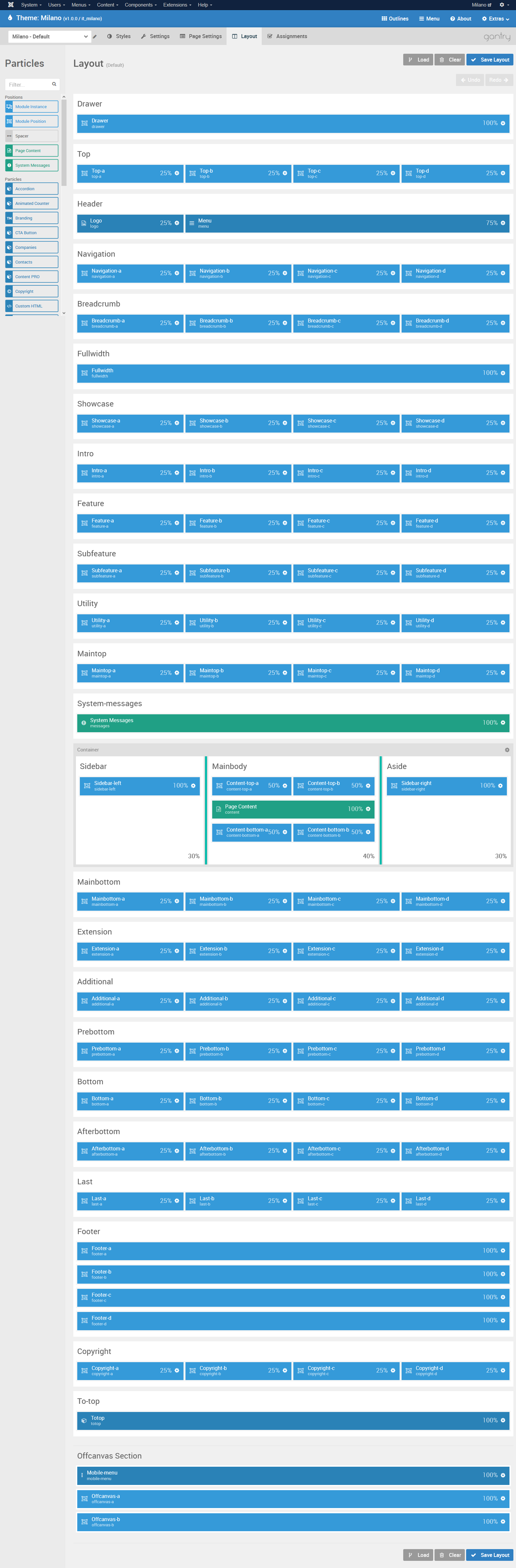 Gantry 5's layout manager benefits from a drag and drop interface, providing an easy mechanism for adding, removing, configuring, moving and re-sizing positions and particles.